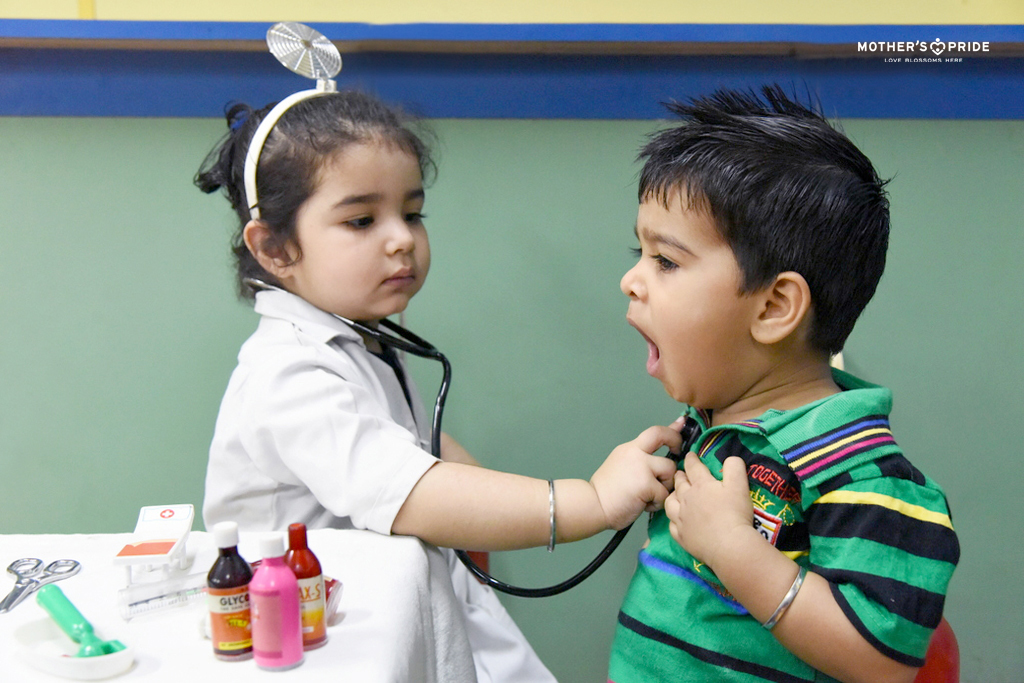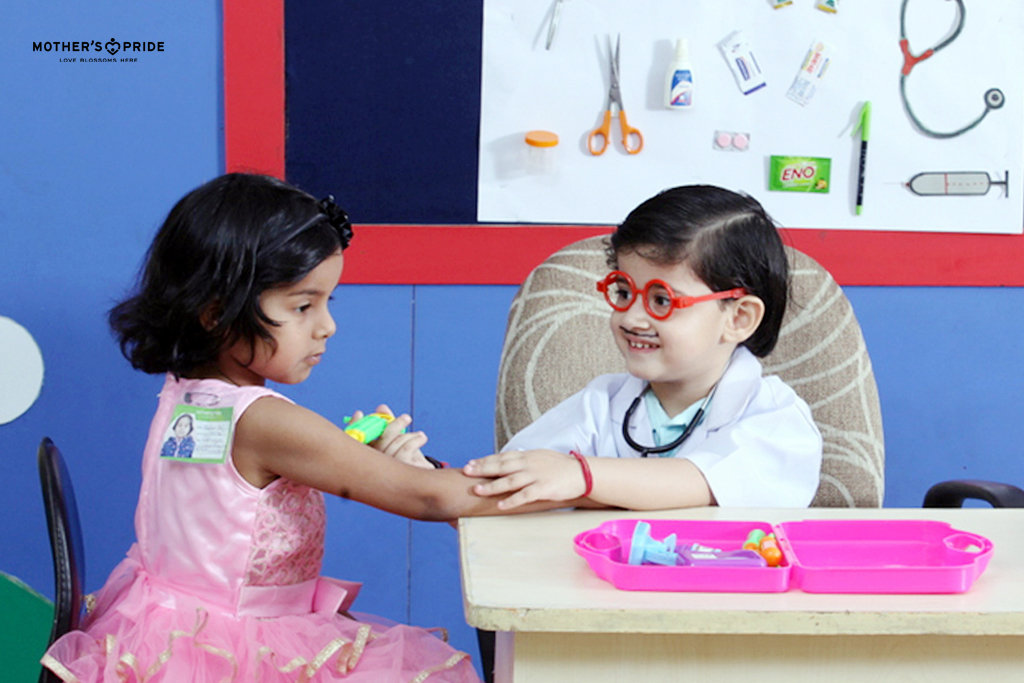 Play is how children learn and pretend play is an ideal way to exercise their creativity and imagination. At Mother's Pride, opportunities are created for our Prideens to blend their skills and knowledge together. To create a better understanding of various concepts, Prideens are engaged in pretend play or role plays. Through this activity, they develop love, respect, and appreciation for the world around them. Imaginary plays also allow kids to develop vocabulary, language and social skills while having loads of fun.