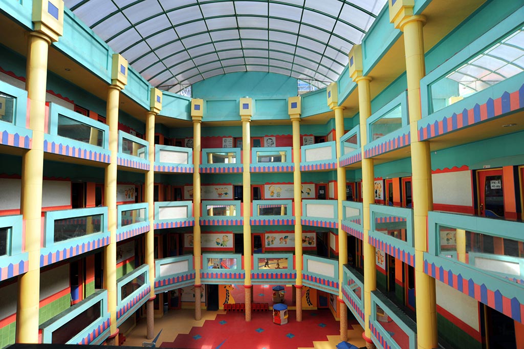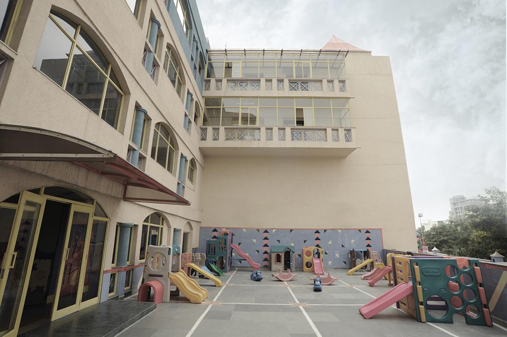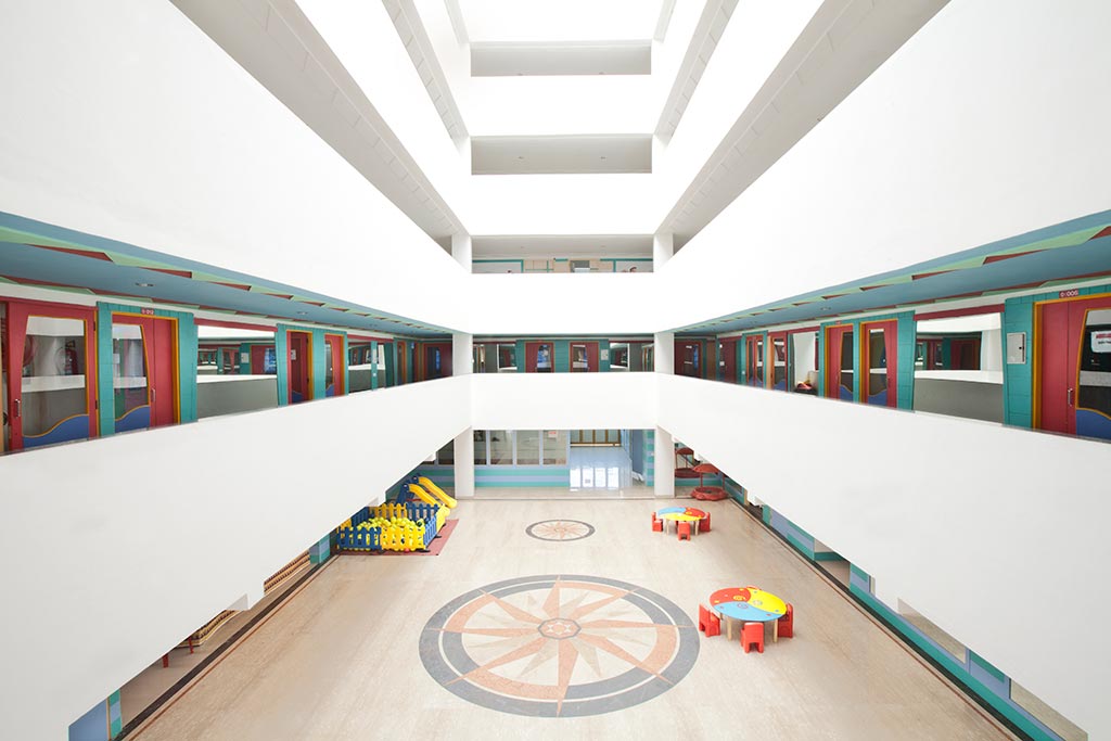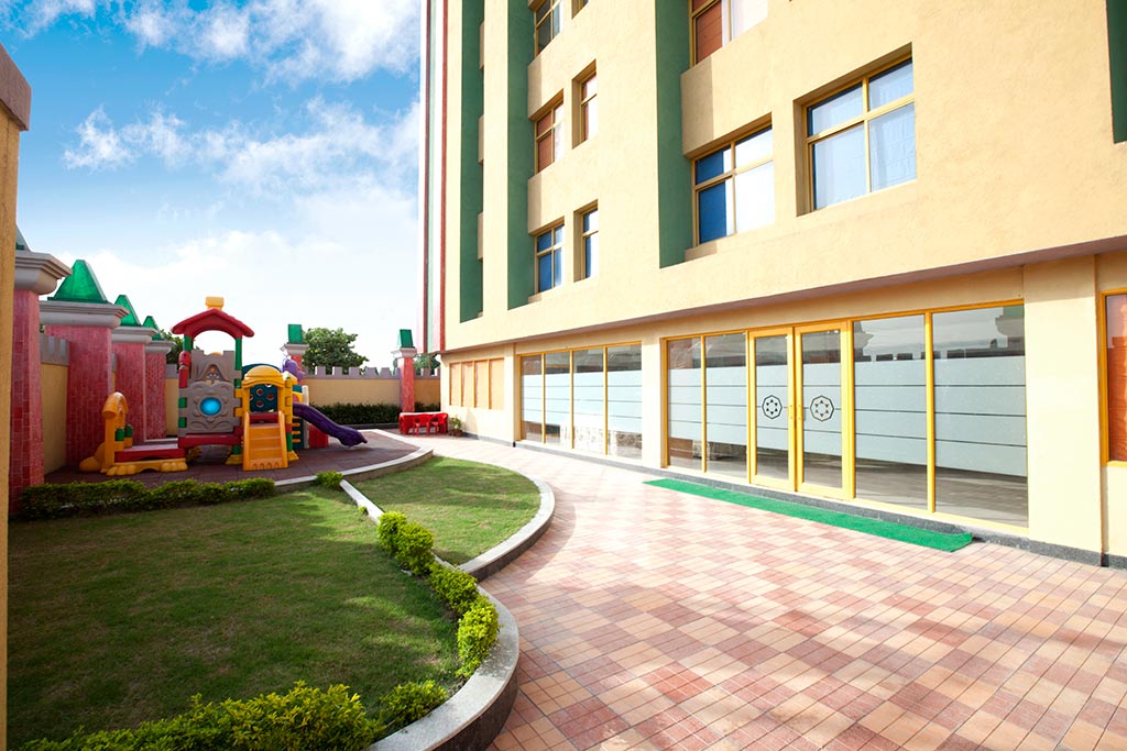 The school infrastructure is designed in a way that the children could have opportunity to learn through playing. The school building itself acts as a learning aid. The architecture is such that it attracts children towards the school, promotes activities and increases peer learning opportunities by making the whole campus a child friendly one.