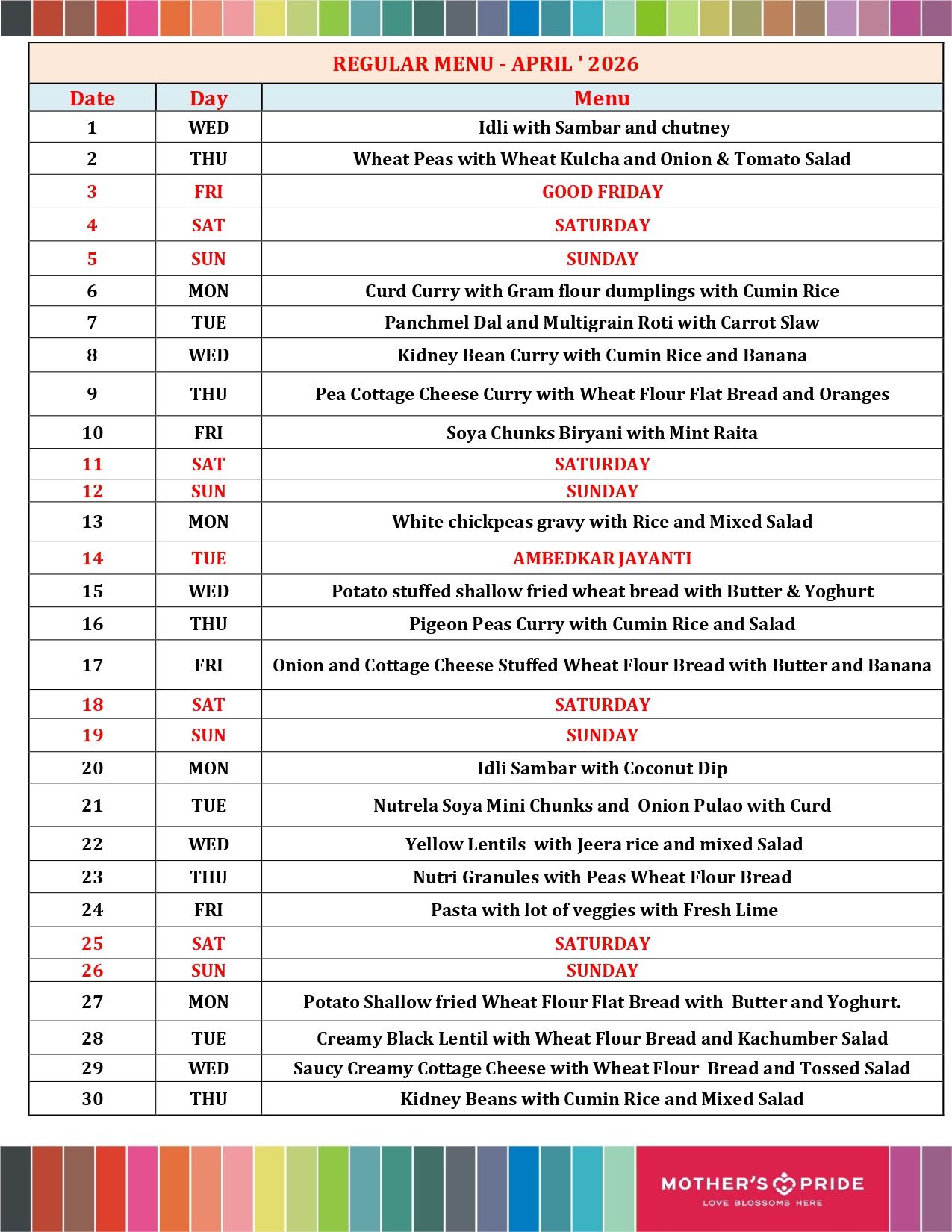 Mother's Pride Annual Menu Card