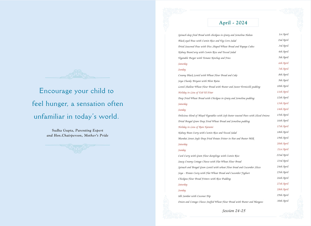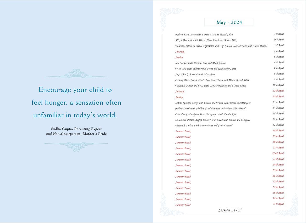 "Don’t give too much of importance to your child’s weight. His energy and stamina indicate his good health." – Sudha Gupta, Parenting Expert & Chairperson Mother’s Pride. At Mother’s Pride, we give utmost importance to healthy food and the in-house menu is designed to provide nutritional balance to children.